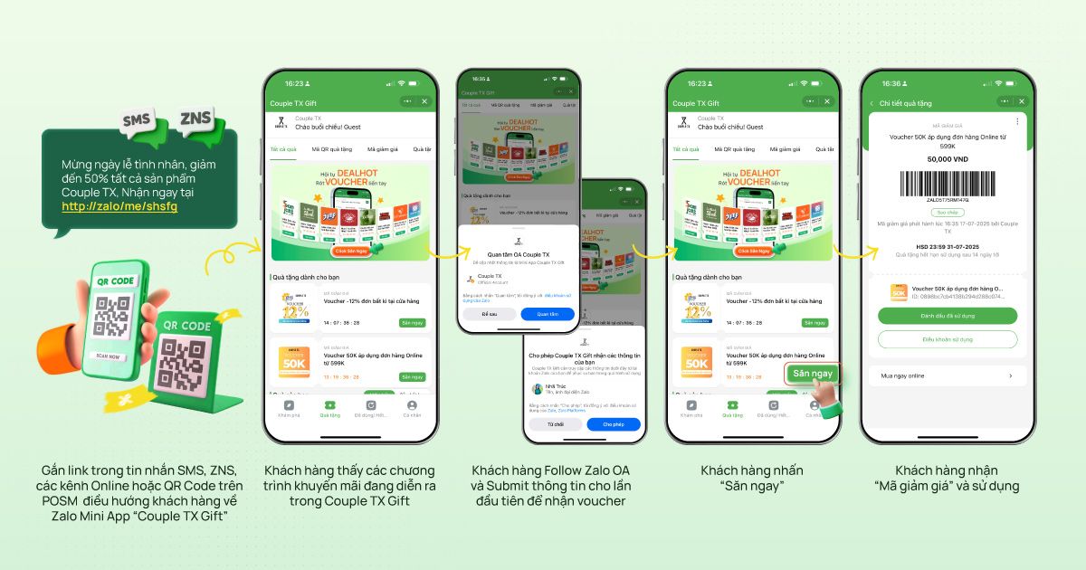 Khách hàng khi nhấn vào link CTA trong tin nhắn, trên các bài viết Social Media hoặc quét mã QR trên các ấn phẩm POSM tại cửa hàng sẽ được chuyển đến Zalo Mini App “Ví voucher Couple TX” trên Zalo.