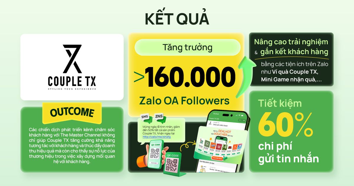 Chiến lược này đã giúp Couple TX tăng trưởng 160.000 người theo dõi OA, tiết kiệm 60% chi phí gửi tin nhắn và nâng cao trải nghiệm khách hàng với các tiện ích trên Zalo Mini App như Ví Voucher Couple TX, Mini Game nhận quà,...